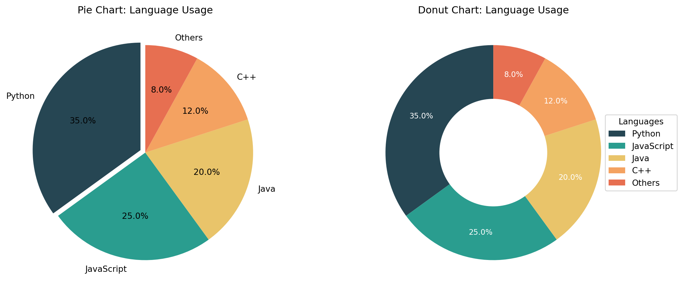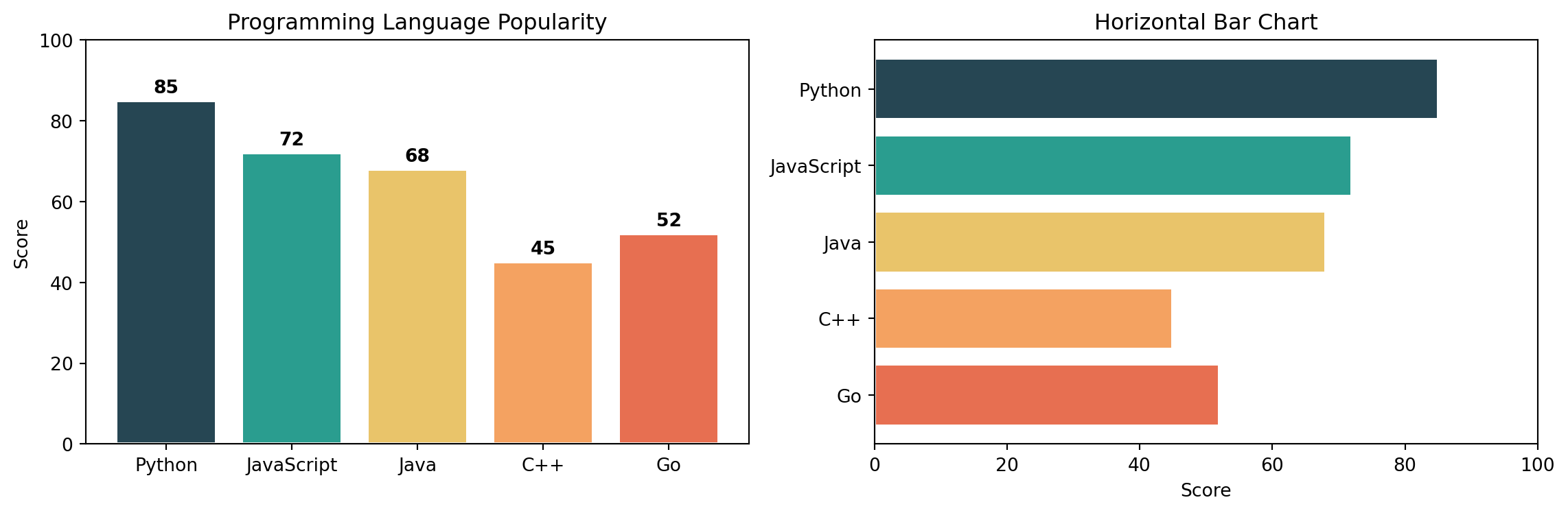 categories = ['Python', 'JavaScript', 'Java', 'C++', 'Go']values = [85, 72, 68, 45, 52]colors = ['#264653', '#2a9d8f', '#e9c46a', '#f4a261', '#e76f51']fig, axs = plt.subplots(1, 2, figsize=(12, 4))# Vertical barsaxs[0].bar(categories, values, color=colors, edgecolor='white', linewidth=1.5)axs[0].set_title("Programming Language Popularity")axs[0].set_ylabel("Score")axs[0].set_ylim(0, 100)# Add value labels on barsfor i, (cat, val) inenumerate(zip(categories, values)): axs[0].text(i, val +2, str(val), ha='center', fontweight='bold')# Horizontal barsaxs[1].barh(categories, values, color=colors, edgecolor='white', linewidth=1.5)axs[1].set_title("Horizontal Bar Chart")axs[1].set_xlabel("Score")axs[1].set_xlim(0, 100)axs[1].invert_yaxis() # Top category firstplt.tight_layout()plt.show()