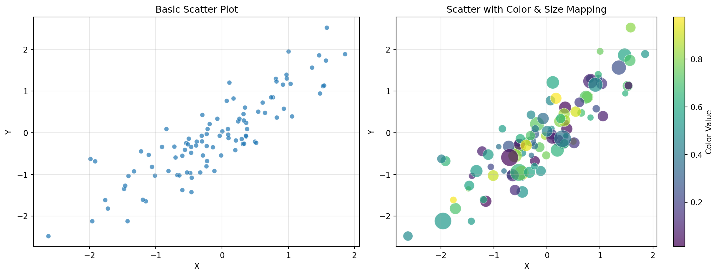 Requirements: - Scatter plot with alpha=0.7 - Different marker size based on y-value - Add a trend line (y = 2x) - Legend distinguishing data vs. trend