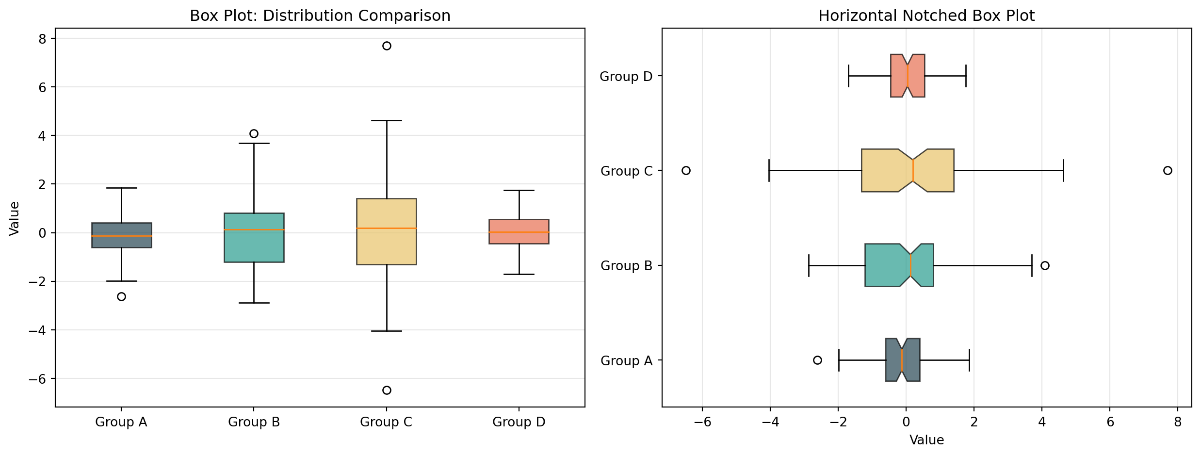 def annotated_heatmap(data, row_labels, col_labels, ax=None, cmap='viridis', fmt='.2f', cbar_label='', title=''):"""Create an annotated heatmap with automatic text color selection."""if ax isNone: ax = plt.gca() im = ax.imshow(data, cmap=cmap)# Color bar cbar = ax.figure.colorbar(im, ax=ax, fraction=0.046, pad=0.04) cbar.ax.set_ylabel(cbar_label, rotation=-90, va="bottom")# Ticks ax.set_xticks(np.arange(len(col_labels))) ax.set_yticks(np.arange(len(row_labels))) ax.set_xticklabels(col_labels) ax.set_yticklabels(row_labels)# Rotate tick labels plt.setp(ax.get_xticklabels(), rotation=45, ha="right", rotation_mode="anchor")# Annotate cells with automatic text color text_threshold = (data.max() + data.min()) /2for i inrange(len(row_labels)):for j inrange(len(col_labels)): color ="white"if data[i, j] > text_threshold else"black" ax.text(j, i, format(data[i, j], fmt), ha="center", va="center", color=color, fontsize=9) ax.set_title(title)return im# Demonp.random.seed(42)data = np.random.rand(6, 8) *100rows = [f'Row {i+1}'for i inrange(6)]cols = [f'Col {i+1}'for i inrange(8)]fig, ax = plt.subplots(figsize=(10, 6))annotated_heatmap(data, rows, cols, ax=ax, cmap='YlOrRd', fmt='.1f', cbar_label='Value', title='Reusable Annotated Heatmap')plt.tight_layout()plt.show()