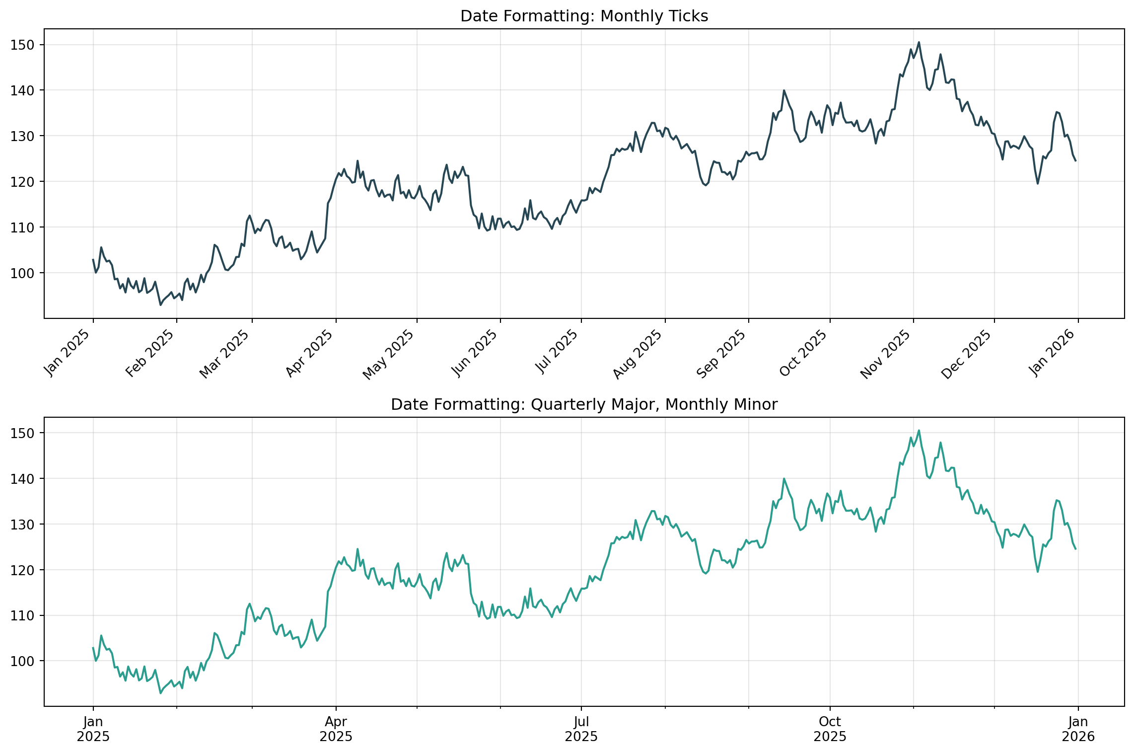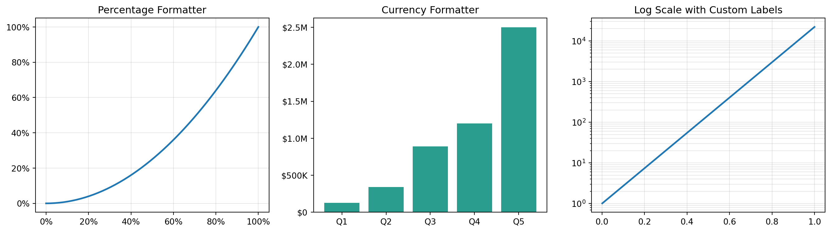 from matplotlib.ticker import FuncFormatter, MultipleLocatorfig, axs = plt.subplots(1, 3, figsize=(14, 4))# Percentage formatterdef percent_fmt(x, pos):returnf'{x*100:.0f}%'x = np.linspace(0, 1, 50)y = x**2axs[0].plot(x, y, linewidth=2)axs[0].xaxis.set_major_formatter(FuncFormatter(percent_fmt))axs[0].yaxis.set_major_formatter(FuncFormatter(percent_fmt))axs[0].set_title("Percentage Formatter")axs[0].grid(alpha=0.3)# Currency formatterdef currency_fmt(x, pos):if x >=1e6:returnf'${x/1e6:.1f}M'elif x >=1e3:returnf'${x/1e3:.0f}K'returnf'${x:.0f}'sales = np.array([125000, 340000, 890000, 1200000, 2500000])axs[1].bar(range(5), sales, color='#2a9d8f')axs[1].yaxis.set_major_formatter(FuncFormatter(currency_fmt))axs[1].set_xticklabels(['Q1', 'Q2', 'Q3', 'Q4', 'Q5'])axs[1].set_xticks(range(5))axs[1].set_title("Currency Formatter")# Scientific formatter with custom precisiondef sci_fmt(x, pos):if x ==0:return'0' exp =int(np.floor(np.log10(abs(x)))) coef = x /10**expreturnf'{coef:.1f}×10$^{{{exp}}}$'x = np.linspace(0.001, 1, 100)y = np.exp(x*10)axs[2].semilogy(x, y, linewidth=2)axs[2].set_title("Log Scale with Custom Labels")axs[2].grid(alpha=0.3, which='both')plt.tight_layout()plt.show()