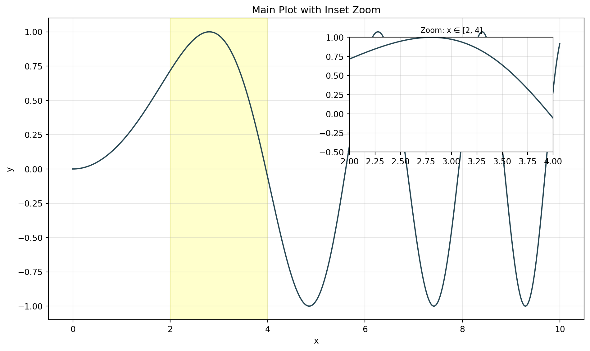 from mpl_toolkits.axes_grid1.inset_locator import inset_axes, mark_insetfig, ax = plt.subplots(figsize=(10, 6))# Main plotx = np.linspace(0, 10, 1000)y = np.sin(x**2/5)ax.plot(x, y, linewidth=1.5, color='#264653')ax.set_title("Main Plot with Inset Zoom")ax.set_xlabel("x")ax.set_ylabel("y")ax.grid(alpha=0.3)# Create inset axesaxins = inset_axes(ax, width="40%", height="40%", loc='upper right', bbox_to_anchor=(0, 0, 0.95, 0.95), bbox_transform=ax.transAxes)# Plot same data in insetaxins.plot(x, y, linewidth=1.5, color='#264653')axins.set_xlim(2, 4) # Zoom regionaxins.set_ylim(-0.5, 1)axins.grid(alpha=0.3)axins.set_title("Zoom: x ∈ [2, 4]", fontsize=9)# Mark the zoom region on main plotax.axvspan(2, 4, alpha=0.2, color='yellow')plt.tight_layout()plt.show()