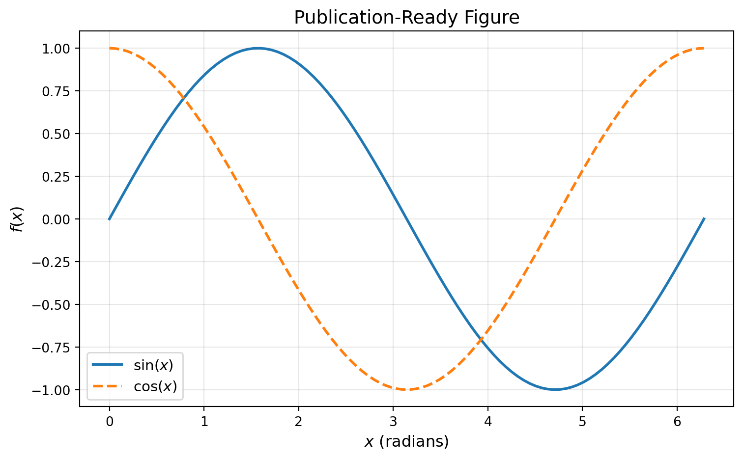 fig, ax = plt.subplots(figsize=(8, 5))x = np.linspace(0, 2*np.pi, 100)ax.plot(x, np.sin(x), linewidth=2, label=r'$\sin(x)$')ax.plot(x, np.cos(x), linewidth=2, linestyle='--', label=r'$\cos(x)$')ax.set_xlabel(r'$x$ (radians)', fontsize=12)ax.set_ylabel(r'$f(x)$', fontsize=12)ax.set_title('Publication-Ready Figure', fontsize=14)ax.legend(fontsize=11)ax.grid(alpha=0.3)# Different save options (uncomment to save)# fig.savefig('figure.png', dpi=300, bbox_inches='tight', facecolor='white') # Web/slides# fig.savefig('figure.pdf', bbox_inches='tight') # LaTeX publications# fig.savefig('figure.svg', bbox_inches='tight') # Scalable, editable# fig.savefig('figure.eps', bbox_inches='tight') # Some journals require EPSprint("Save options:")print("- PNG: dpi=300+ for print, dpi=150 for web")print("- PDF: Vector, perfect for LaTeX") print("- SVG: Editable in Inkscape/Illustrator")print("- EPS: Legacy format for some journals")plt.tight_layout()plt.show()