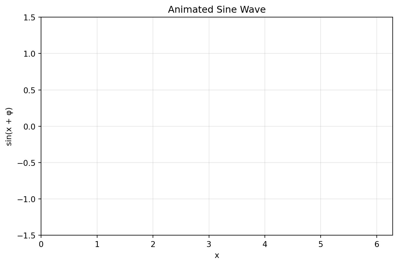 Requirements: - Draw a sine wave that would animate through phase shifts - Add a moving marker point on the curve - Set axis limits appropriately - Add title showing frame number placeholder