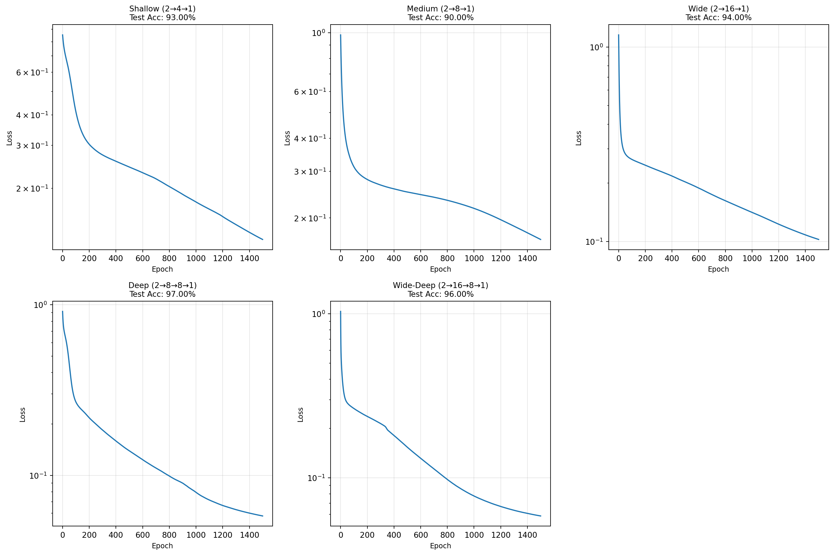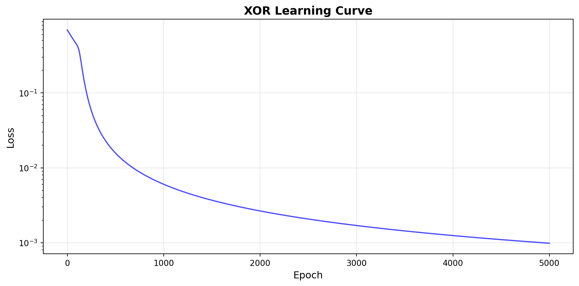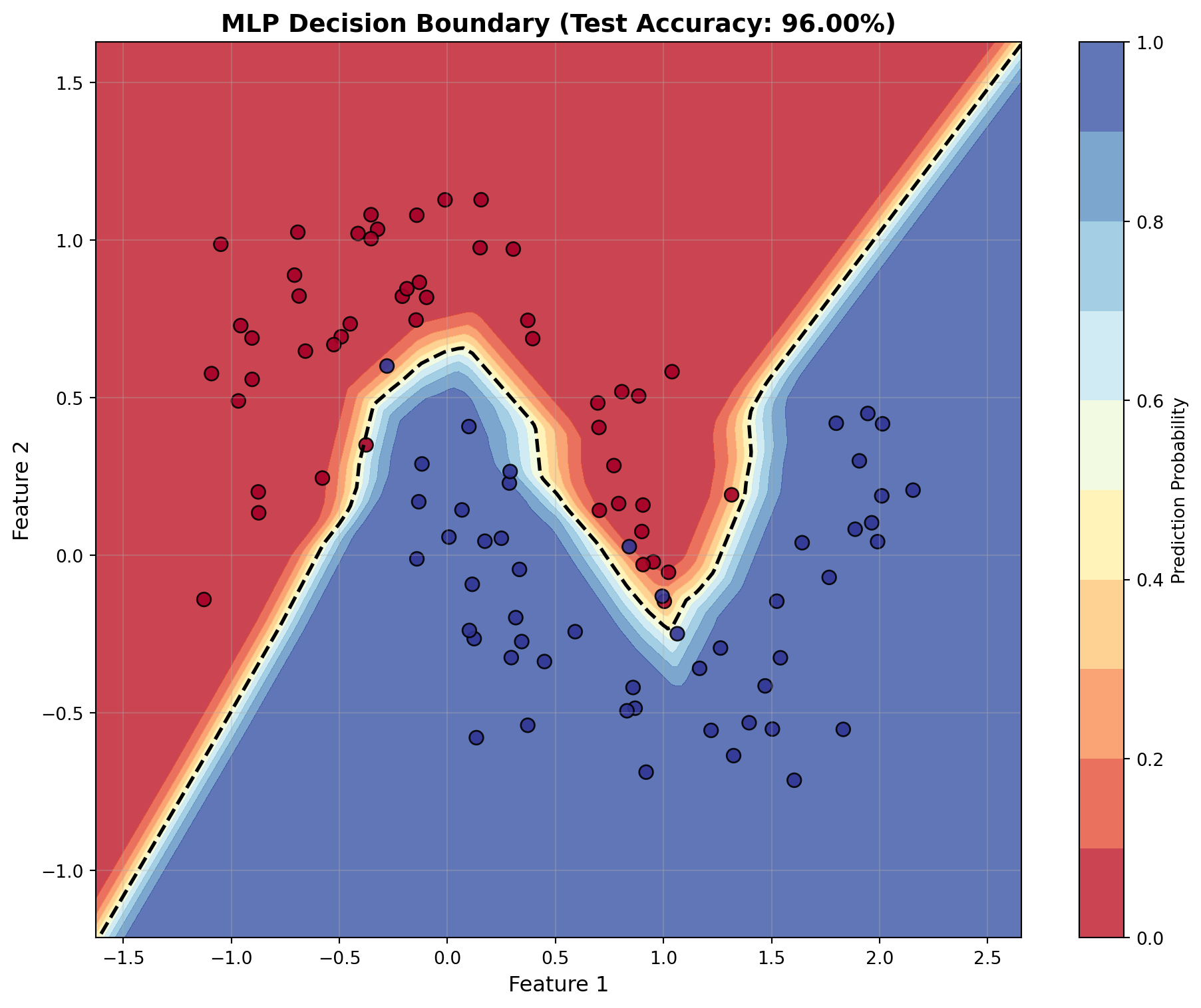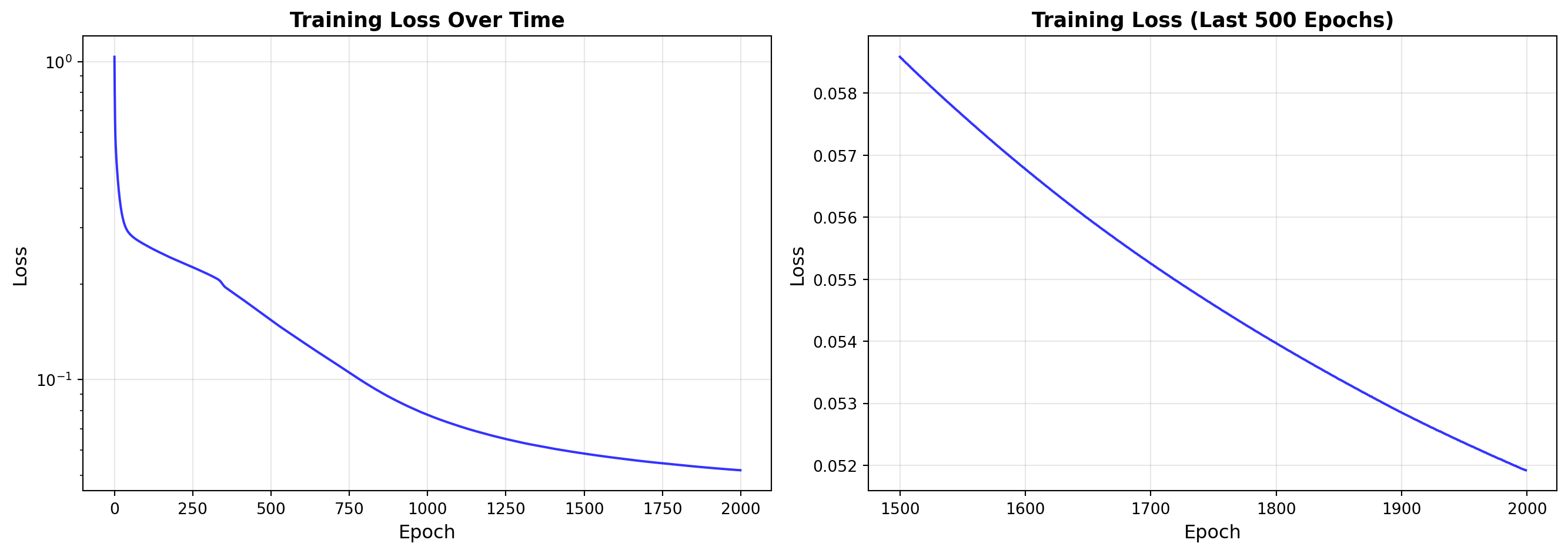 # Create MLP with architecture suited for this problemmlp = MLP( layer_sizes=[2, 16, 8, 1], # 2 inputs → 16 → 8 → 1 output activations=['relu', 'relu', 'sigmoid'], learning_rate=0.1, seed=42)print(f"\n🏋️ Training on Moons Dataset...")print("-"*60)losses = mlp.train( X_train_T, y_train_T, epochs=2000, print_every=200, verbose=True)# Evaluate on test settest_accuracy = mlp.evaluate(X_test_T, y_test_T)train_accuracy = mlp.evaluate(X_train_T, y_train_T)print("\n"+"="*60)print("FINAL RESULTS")print("="*60)print(f"Training Accuracy: {train_accuracy:.2%}")print(f"Test Accuracy: {test_accuracy:.2%}")print("="*60)