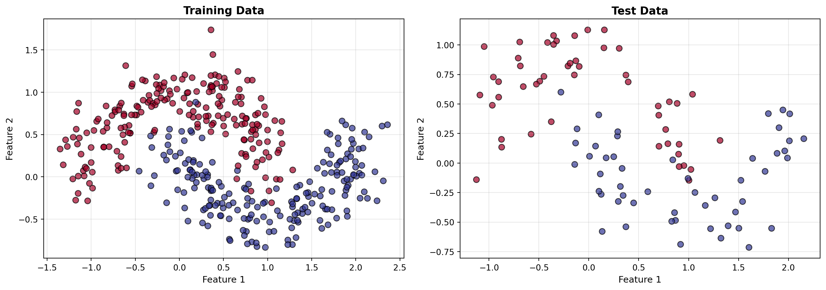 def make_moons_manual(n_samples=500, noise=0.2, seed=42):""" Create a moons dataset from scratch (no sklearn needed!) """ np.random.seed(seed) n_samples_per_moon = n_samples //2# First moon (upper) theta1 = np.linspace(0, np.pi, n_samples_per_moon) x1 = np.cos(theta1) y1 = np.sin(theta1)# Second moon (lower, shifted) theta2 = np.linspace(0, np.pi, n_samples_per_moon) x2 =1- np.cos(theta2) y2 =1- np.sin(theta2) -0.5# Combine X = np.vstack([ np.column_stack([x1, y1]), np.column_stack([x2, y2]) ])# Add noise X += np.random.normal(0, noise, X.shape)# Labels y = np.hstack([np.zeros(n_samples_per_moon), np.ones(n_samples_per_moon)]).astype(int)# Shuffle indices = np.random.permutation(n_samples)return X[indices], y[indices]def train_test_split_manual(X, y, test_size=0.2, seed=42):"""Split data into train and test sets""" np.random.seed(seed) n_samples =len(y) n_test =int(n_samples * test_size) indices = np.random.permutation(n_samples) test_idx, train_idx = indices[:n_test], indices[n_test:]return X[train_idx], X[test_idx], y[train_idx], y[test_idx]def standardize(X_train, X_test):"""Standardize features (zero mean, unit variance)""" mean = X_train.mean(axis=0) std = X_train.std(axis=0) X_train_scaled = (X_train - mean) / std X_test_scaled = (X_test - mean) / stdreturn X_train_scaled, X_test_scaled, mean, std# Create a moons datasetX, y = make_moons_manual(n_samples=500, noise=0.2, seed=42)# Split into train and testX_train, X_test, y_train, y_test = train_test_split_manual(X, y, test_size=0.2, seed=42)# Standardize featuresX_train_scaled, X_test_scaled, data_mean, data_std = standardize(X_train, X_test)# Transpose for our MLP (features × samples)X_train_T = X_train_scaled.TX_test_T = X_test_scaled.Ty_train_T = y_train.reshape(1, -1)y_test_T = y_test.reshape(1, -1)print("="*60)print("MOONS DATASET (Created from scratch!)")print("="*60)print(f"Training samples: {X_train_T.shape[1]}")print(f"Test samples: {X_test_T.shape[1]}")print(f"Features: {X_train_T.shape[0]}")print(f"Class distribution (train): {np.bincount(y_train)}")# Visualizefig, axes = plt.subplots(1, 2, figsize=(14, 5))# Training datascatter = axes[0].scatter(X_train[:, 0], X_train[:, 1], c=y_train, cmap='RdYlBu', edgecolors='black', alpha=0.7, s=50)axes[0].set_xlabel('Feature 1', fontsize=11)axes[0].set_ylabel('Feature 2', fontsize=11)axes[0].set_title('Training Data', fontsize=13, weight='bold')axes[0].grid(True, alpha=0.3)# Test dataaxes[1].scatter(X_test[:, 0], X_test[:, 1], c=y_test, cmap='RdYlBu', edgecolors='black', alpha=0.7, s=50)axes[1].set_xlabel('Feature 1', fontsize=11)axes[1].set_ylabel('Feature 2', fontsize=11)axes[1].set_title('Test Data', fontsize=13, weight='bold')axes[1].grid(True, alpha=0.3)plt.tight_layout()plt.show()