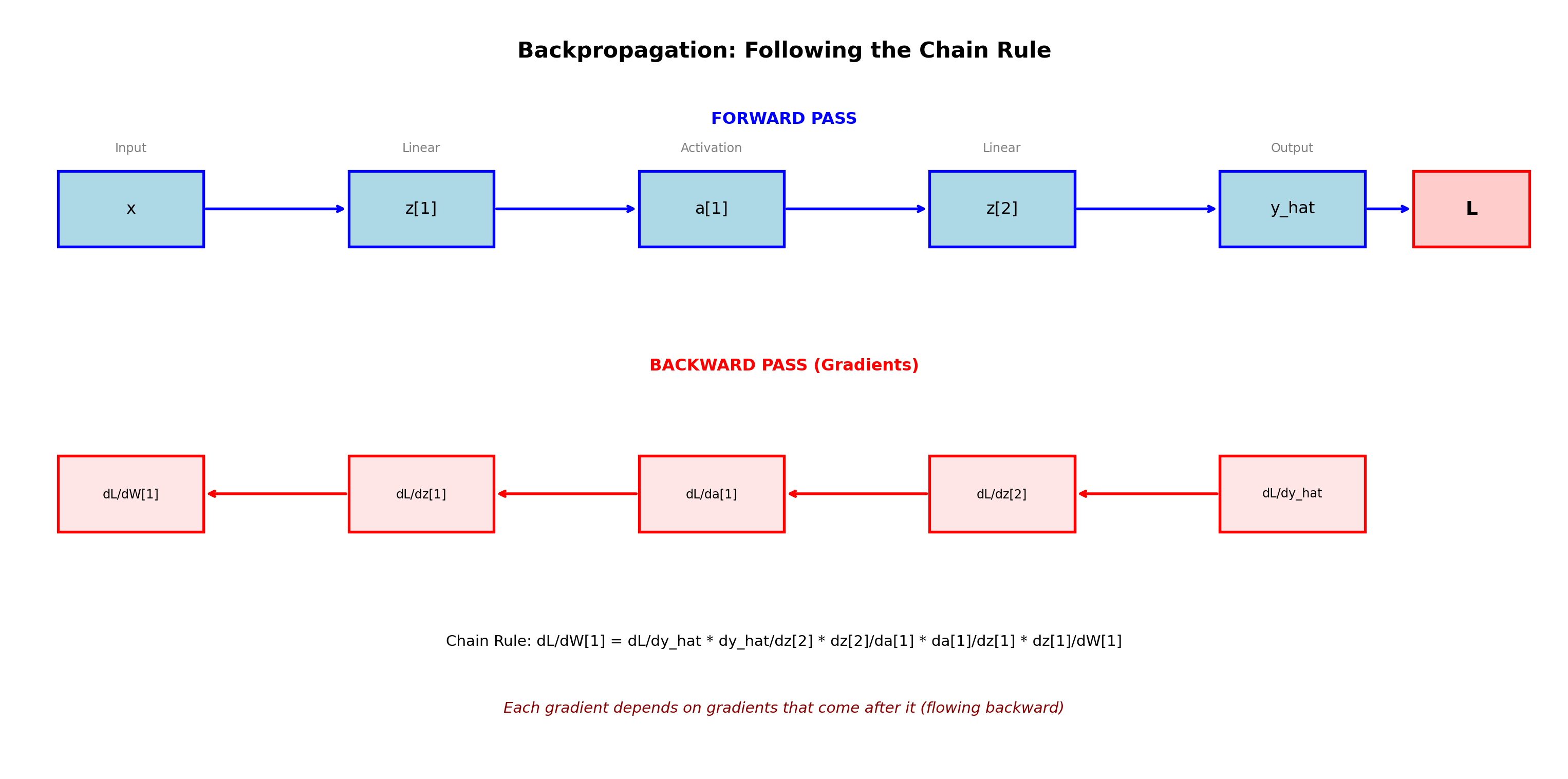 The magic of neural networks lies in their ability to learn. This happens through backpropagation—computing gradients of the loss function with respect to each parameter.