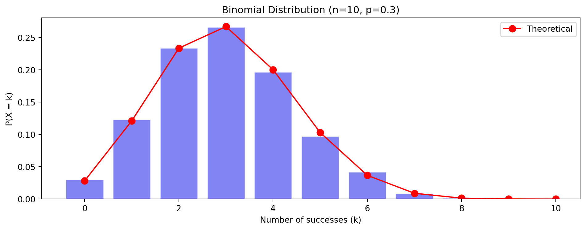 import numpy as npimport matplotlib.pyplot as pltfrom scipy import statsnp.random.seed(42)# Example 1: Coin flip as a random variable# Sample space: {Heads, Tails}# Random variable X: Heads -> 1, Tails -> 0def coin_flip_rv(n_flips=10):"""Simulate coin flips as random variable values.""" outcomes = np.random.choice(['Heads', 'Tails'], size=n_flips)# Map to numbers X = np.array([1if o =='Heads'else0for o in outcomes])return outcomes, Xoutcomes, X = coin_flip_rv(10)print("Coin Flip Random Variable:")print(f" Outcomes: {outcomes}")print(f" X values: {X}")print(f" Sum (count of heads): {X.sum()}")