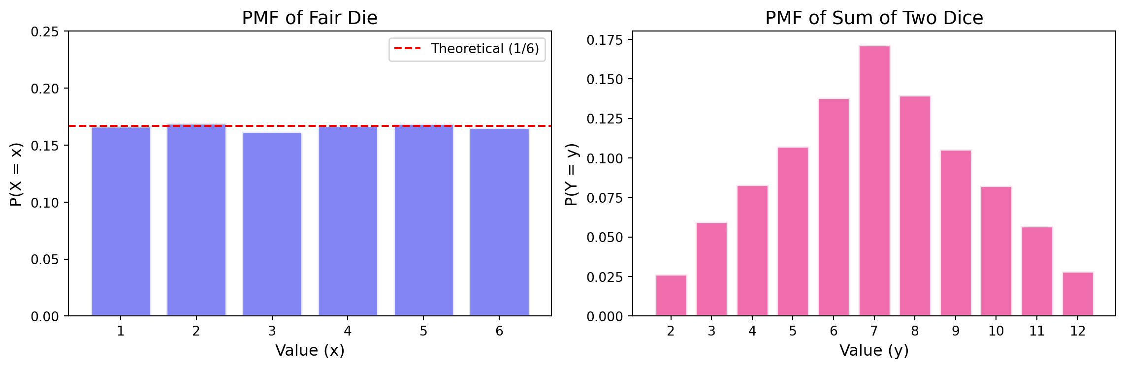 # Visualize PMFfig, axes = plt.subplots(1, 2, figsize=(12, 4))# Fair die PMFax = axes[0]ax.bar(values, pmf, color='#6366f1', alpha=0.8, edgecolor='white', linewidth=2)ax.axhline(y=1/6, color='red', linestyle='--', label='Theoretical (1/6)')ax.set_xlabel('Value (x)', fontsize=12)ax.set_ylabel('P(X = x)', fontsize=12)ax.set_title('PMF of Fair Die', fontsize=14)ax.set_xticks(range(1, 7))ax.legend()ax.set_ylim(0, 0.25)# Sum of two dice PMFX1 = np.random.randint(1, 7, size=10000)X2 = np.random.randint(1, 7, size=10000)Y = X1 + X2values_y, pmf_y = compute_pmf(Y)ax = axes[1]ax.bar(values_y, pmf_y, color='#ec4899', alpha=0.8, edgecolor='white', linewidth=2)ax.set_xlabel('Value (y)', fontsize=12)ax.set_ylabel('P(Y = y)', fontsize=12)ax.set_title('PMF of Sum of Two Dice', fontsize=14)ax.set_xticks(range(2, 13))plt.tight_layout()plt.show()