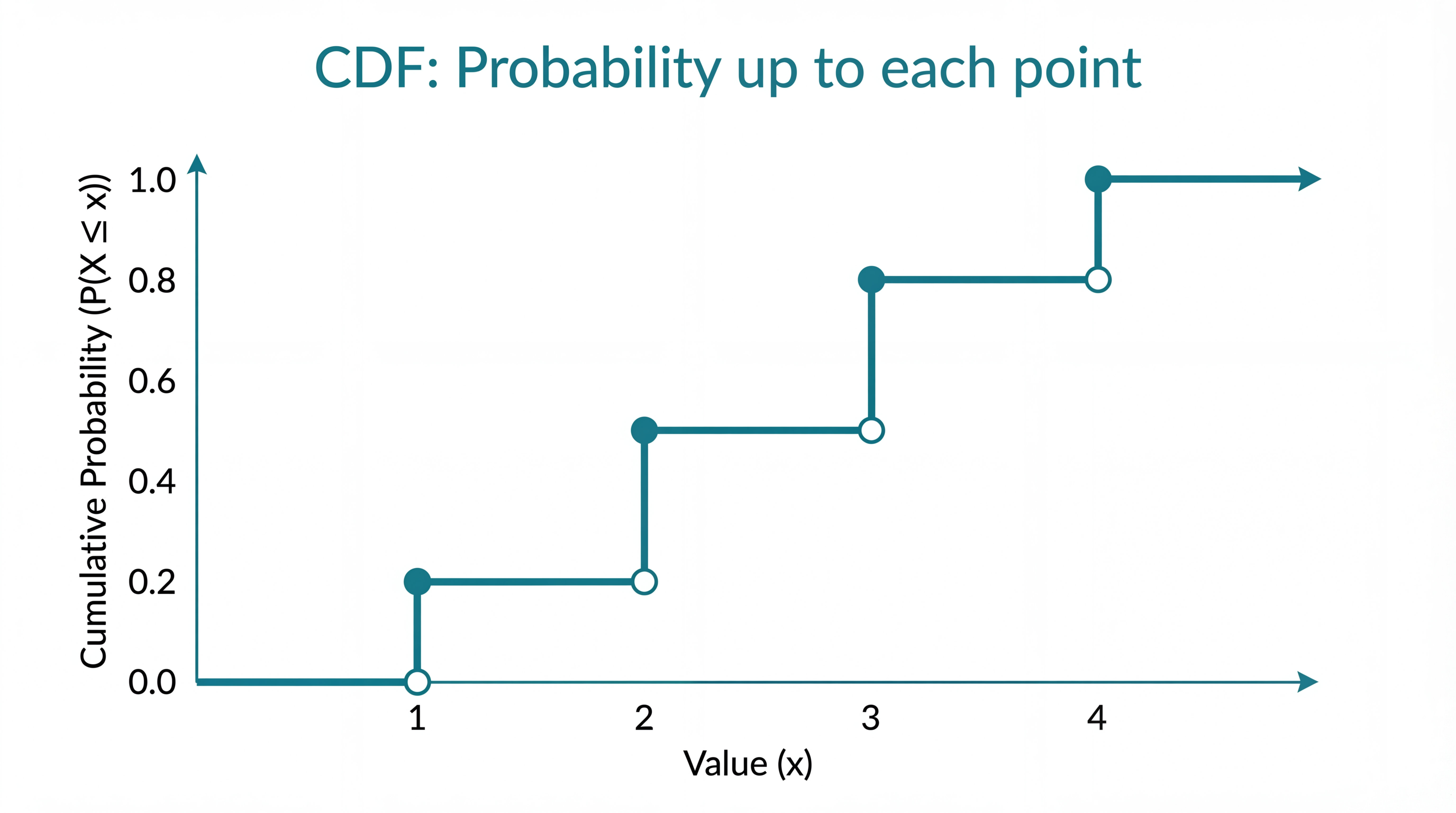 Key property: CDF always goes from 0 to 1, never decreasing.